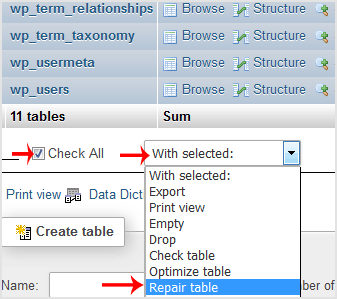 5. Scroll down and mark Check All then click on the Drop-down option and select Repair table.
